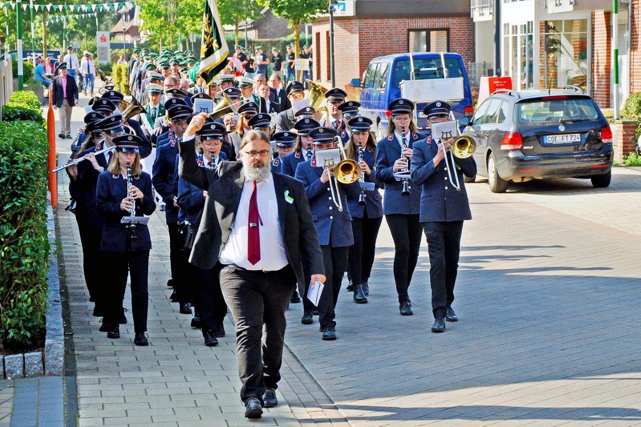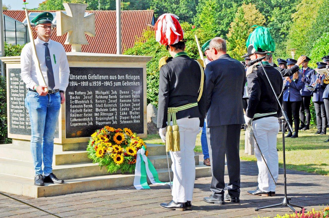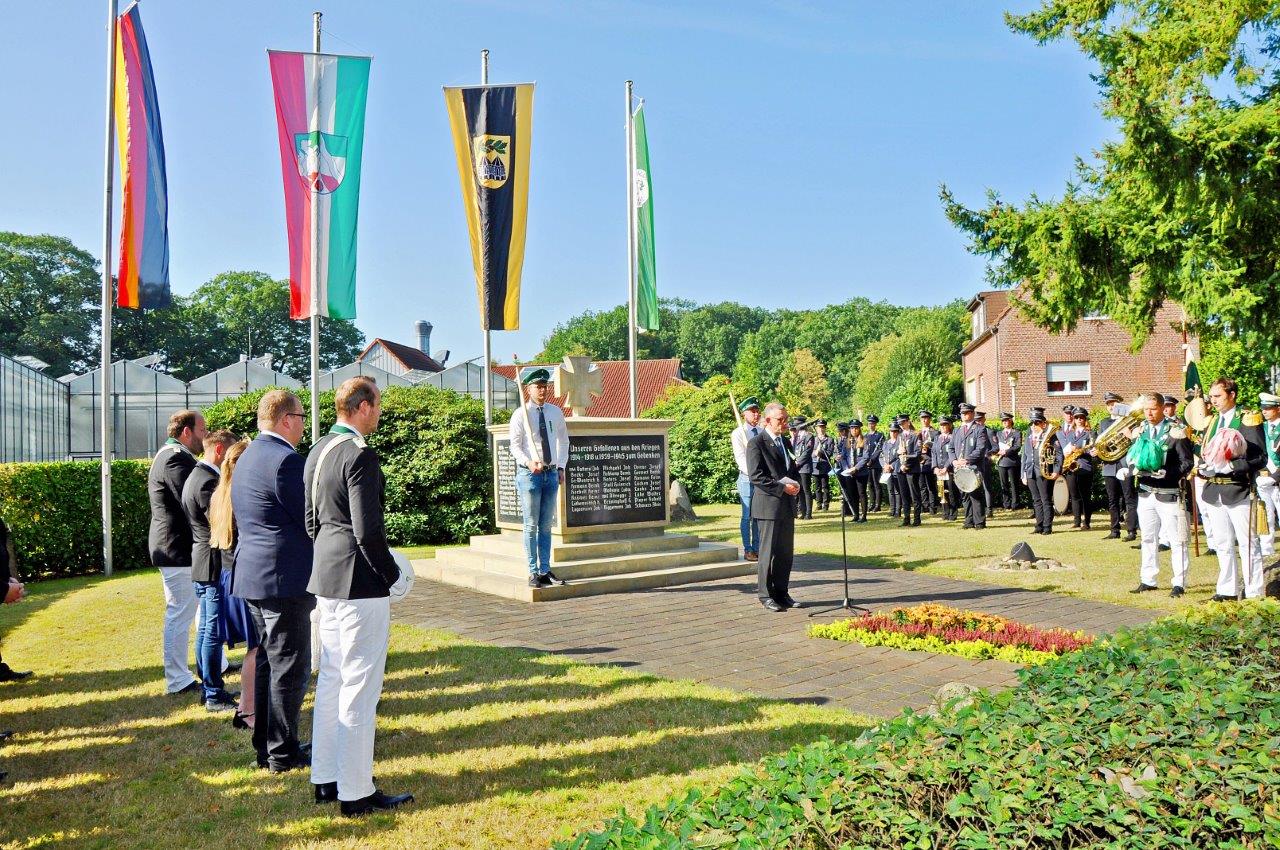 Anschließend werden wir am Ehrenmal einen Kranz für die Opfer der beiden Weltkriege niederlegen. Die Blaskapelle Reken wird die Veranstaltung musikalisch untermalen und, wenn es die Corona Verordnungen zulassen, uns auf dem Zug durchs Dorf zum Festplatz begleiten.
